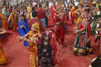 It is a very simple dance and is performed by a group who move in circles to measure steps, marking time by sticks called Dandiya. Dandiya are the featured dances of Navratri evenings in Gujarat. The sticks of the dance represent the sword of Durga. Women normally perform it in a graceful and rhythmic manner in a circle as they rotate around the 'mandvi'. The women in Dandiya wear traditional dresses such as colorful embroidered choli, ghagra and bandhani dupattas dazzling with mirror work and heavy jewellery.The major difference between the 'Garba' and 'Dandiya' dance performances is that Garba is performed before 'Aarti' while Dandiya is performed after it. Garba is performed exclusively by women, men and women join in for Dandiya. Also known as 'stick dance' as performers use a pair of colorfully decorated sticks as props, the circular movements of Dandiya Raas are slightly more complex than that of Garba.
