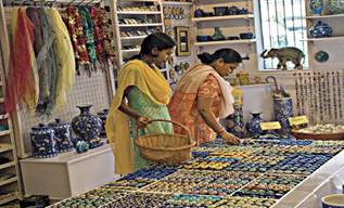 2.Pavement shops leading to Umaid Bhawan - handicrafts ethnic land of mirrors, sequins, beads, textiles, silver, jewelry, instruments, pottery, boxes, carved ducks, metalwork, marble figures, paintings, copper, brass, antique reproductions, ivory, and insignias in white German metal, bed covers, wall hangings, puppets, clothes and old doors.