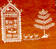 Women decorate their home according to their own fantasies and ideas. This is one of the most expressive craft form. The flowing linear patterns on the floor of beaten clay are worked with rice paste.