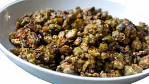 - When the seeds turn a rich brown and fragrant, add the okra.