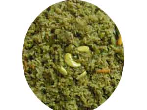 Once the rice is almost cooked,add it to the gravy mixture and mix well gently with a spatula. Taste for salt and spices and make necessary additions.Remove from flame and let the spices and spinach blend with the rice. - Transfer the Pulao to a serving dish. Take a firm tomato, cut it into thin wedges,garnish it with them.