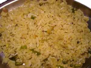 - While the rice cooks, take another pan, add oil,jeera seeds and the bay leaves. When they start spluttering, add the green chillies and the chopped onions. Saute till they turn a light golden in colour.