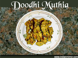 - Combine all the ingredients for the muthias in a bowl and knead into a very soft dough adding the strained vegetable liquid if required.