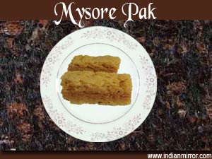 Mysore pak is a sweet dish of Karnataka, India, usually served as dessert. It is made of generous amounts of ghee (clarified butter), sugar and chick pea (besan) flour.Mysore Pak was first created in the kitchens of the Mysore Palace by a palace cook named Kakasura Madappa out of the above ingredients