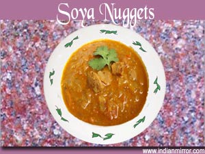 - Strain the soya nuggets. Add curd, ½ cup water and soya nuggets to the prepared masala. Microwave (covered) for 3 - 4 mins. Stir in between.