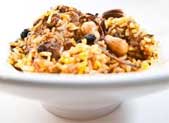 Dhansak consists of several types of lentils cooked with meat and vegetables and served with fried brown rice and kababs.