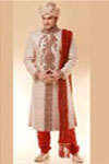 Sherwani Churidar pyjama or Jodhpurs (breeches) are used as lower garments with sherwani instead of pants which are the modern attire as we use with western jackets. Safas (turbans) worn as headgear and Mojaris (juti) are worn instead of shoes. All of them when worn together with sherwani makes a complete wedding dress. Mojaris are generally made with the same fabric from which the sherwani is made with the touch of same embroidery work with which sherwani is adorned. Sherwani is a long coat, it has buttons in the front with ban collars. The sherwani looks good well below the knees, and looks elegant especially if the groom is tall. The sherwanis are available in many colors. Off-white, beige and cream shades are more popular amongst men.