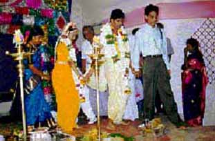 The bride's house is usually decorated with strings of flowers. When the groom arrives the bride's mother welcomes him by applying Kumkum on his forehead and sprays rice grains over him.