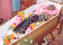 When a person dies, a lamp is lit and placed near the dead body. The body is placed in the north-south direction with the head towards the north. The eyes are closed and the feet are tied together. The eldest son is supposed to do the last rites. The body is bathed and is covered with new clothes. Then the members of the family apply oil on the forehead of the deceased. Then the body is decorated with flower garlands and is taken to the cremation ground. Usually the sons and other male members carry the dead. Women are not allowed to go to the ground. They bid farewell to the deceased at the home itself. At the cremation ground, the son applies ghee at seven important places in the body and also places coins on the forehead. Grains of rice and til are put into the mouth of the body. Wooden logs are placed over the body and ghee is sprinkled all over. The son goes round the body seven times with a pot of water and at last the pot is broken near the feet of the dead. Then as the priest chants the mantra, the son takes the Agni or fire and places it on the heart of the body.