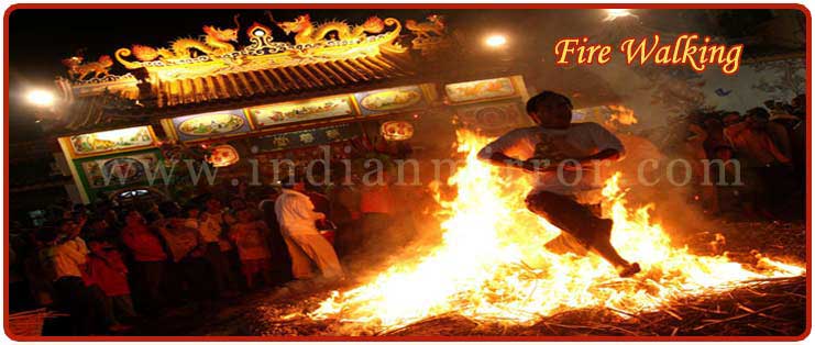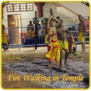 -At the end of the session the fire in the pit is extinguished with milk and water. The ceremony of Theemithi comes to an end only after two days after the actual event has taken place and also by reading the final chapter of Mahabharata where the victory of the great war is signified by the lowering of the flag which was hoisted before the ceremony.Fire walking is also part of Theyyam ritual in Northern Kerala. This is a kind of dance where the devotees wear burning wicks around their waist and walk in the fire pit. In the Uccitta ritual associated with Theyyam, the dancer jumps into the fire and sits in fire, symbolizing Sati who self immolated during Daksha Yaga. The Mariamman temple in Singapore and the Bannari Amman temple in Tamil Nadu, India is said to attract lot of devotees and gains extreme media attention. The fire walking rituals held at the Sri Mariamman Hindu Temple in Singapore before Diwali and at the Bannari Amman temple in Tamil Nadu attract lot of media attention. Many people have also raised their voice against the fire ritual stating it is dangerous and should not be permitted in a modern society. But the ritual is still practiced in small villages, towns and in cities across India.