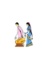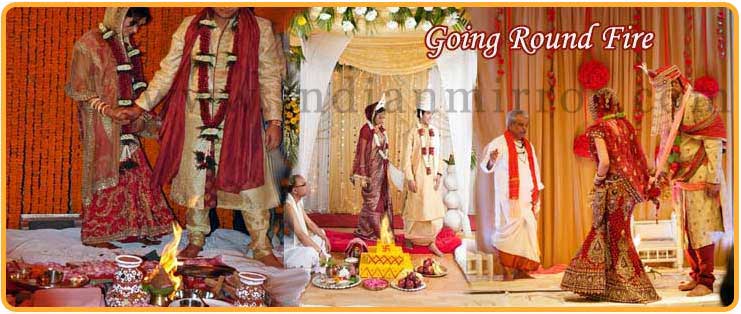 It is a customary ritual among the Hindus where at the time of wedding the married couples will have to come round the sacred fire seven times which is lit amidst chants of wedding mantras. The entire ceremony of marriage is led by a Hindu priest or pandit in the presence of the God of fire or Agni Dev and of course parents, relatives and friends taking the vow of that they will be religiously bound in mutual relationship. The God of Fire who is going to witness the ceremony is ignited by clarified butter and woolen wicks. Just before the couple take their move to go around the Agni Dev the bride's sari is tied to the grooms kurta or shawl which falls from his shoulder. As the priest chants the mantras the wedded couple go around the sacred fire seven times for the seven blessings by taking a vow for a strong commitment throughout their life.