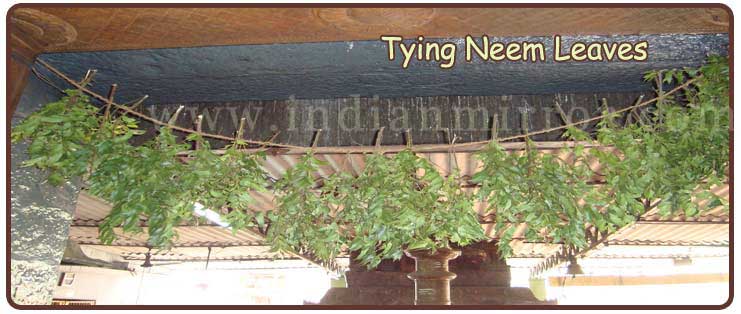 -There are lot of mentions about the significance of the neem tree in ancient epics and puranas. Scientifically it is said that neem leaves are supposed to release maximum oxygen when compared to any other tree. Neem leaves are also used to give bath for the brides and even now in remote areas new born babies are laid upon the Neem leaves to provide them with the protective aura. Neem leaves have lot of antibacterial properties and thats one of the main reason why it is used to be hung at the entrance of sick people's house who are mainly affected with chicken pox, small pox and measles.It also signifies a warning symbol from other healthy person not entering the house of the infected.