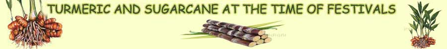 Turmeric and sugar cane are mainly used at the celebration of Pongal festivals. The yellow vermillion powder got from turmeric is a sign of auspiciousness according to Hindus in India. Pongal is one of the most traditional festivals of the Hindus which falls in the month of January and is celebrated in honour of thanksgiving to nature during the season when rice and other cereals, sugar-cane, and turmeric, are harvested and all of them form an essential part of our daily cooking. At the time of Pongal celebrations there is a custom or ritual of tying a turmeric plant round the pot in which the rice will be boiled. The offerings include coconut and bananas in a dish, with two sticks of sugar-cane in the background.