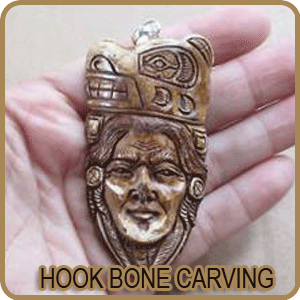 There can be no two pieces done by carving to be similar because it is crafted by hand portraying a traditional story with exotic inlays of shell or precious stones. Any artifact of a bone carving is displayed or sold with a braided or plaited waxed braid cord with bound in loop and toggle, along with woven native flax bag designed to show of the traditional styling and beauty of the carving.