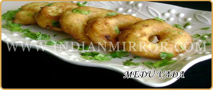 -Medu Vada or the Indian doughnut is one of the most traditional foods of South India rated high for its ancient past. Medu vada is a favorite South Indian food which is very commonly prepared at home and it is an indispensable part of everyday cuisine. Vada is an absolutely necessary part of the menu in South India on festivals, puja days and on occasions. Vada is prepared by deep frying the dough in the oil and then it is served along with palatable accompaniments. Vada is mostly disc shaped which can take varying size and shape and is usually 5 to 8 cm across. The primary ingredients which are used in the preparation of Vada are dal, lentil and gram flour.