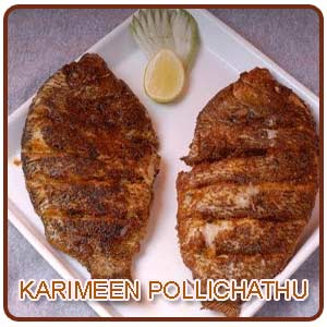 Various dishes can be prepared with the karimeen and some of the prominent dishes include Karemeen Fry, Karemeen Molly and Karemeen Pollichathu. The fishes are slightly on the expensive side and are very much available throughout the year. There is no particular season for it. The green chromide fishes are mainly trapped by using gillnets. Karimeen enjoys the pride to be the official fish of the Kerala state which was declared by the state Government in the year 2010. In fact the year 2010-'11 was observed as 'The Year of the Karimeen" which is mainly to boost the production of this particular variety namely Etroplus suratensis. It commonly reaches 20 centimeters (7.9 in) in length, and the maximum length is twice that of a normal fish .Karimeen pollichathu is one among the star food of Kerala and is also known as pearl spot because of its appearance and its unique way of cooking makes it to stand apart in its preparation.