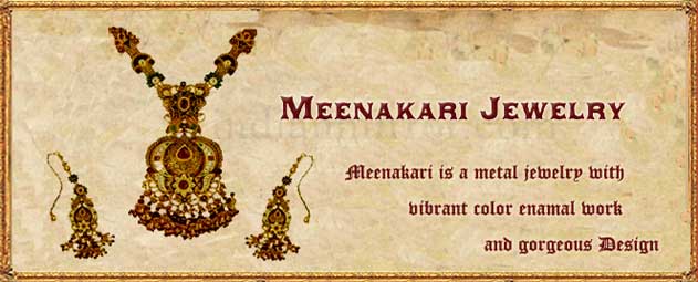 In Meenakari Jewelry, precious stones are set and then enameled with gold. Historically speaking this ancient art was introduced to Rajasthan artisans by Raja Mansingh of Amer. He had invited Lahore-based skilled artisans to his kingdom, and their intermingling with the local craftsmen resulted in an amalgam, which came to be known as Meenakari. Meenakari is all about team work, where specialization of skill is of paramount importance. As it is generally done on the reverse side of kundan jewellery, meenakar has to work with goldsmith, engraver or ghaaria, designer or chitteria as well as jadiya.