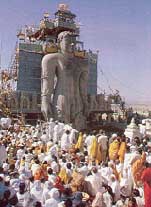 Once in every 12 years, the Mahamastakabhishekh or the ritual anointing of the giant monolithic statue of the great Jain saint Gomateshwara takes place.