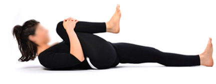 - Inhale and bend the right knee and pull it close to the torso with both hands while interlocking the fingers just below the knee. Keep the left leg flat on the floor.