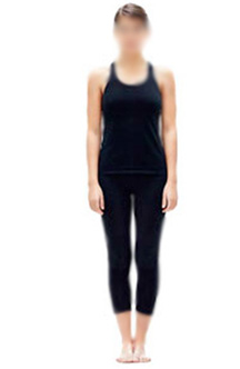 - Stand with both feet touching from the heel to the big toe, keeping the back straight and the arms pressed slightly against the sides with palms facing inward.