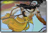 When Durvasa finished his meditation and came to the spot, he realized what had happened, he felt very insulted thinking that Ambarisha has done this out of pride. Durvasa got very angry and he tore a tuft of hair and made it to become a demon. Now he cursed the king by asking the demon to kill him. But the king did not react to all this instead remained calm with no fear for the chakra given by Lord Narayana came to the protection of the king. The chakra also progressed in the direction towards Durvasa and the demon also lost all his power. Now the great rishi did not know what to do and to save his life he ran to Brahma and Lord Shiva. But unfortunately they told him that he had been very harsh to a Vishnu Bhakthan and they are helpless. Durvasa tried all his means to escape from the chakra but he could do nothing. Finally he ran and appealed to Sri Vishnu for help. Lord Vishnu told Durvasa, that he is a slave to all his devotees and he cannot forsake them at the time of their requirement. He suggested to the rishi that there is only one way to escape from the chakra and that is to run back to the person whom the rishi has offended and to beg his pardon. Thus Durvasa went back immediately to Ambarisha and apologized and the king made the chakra stop from destructing the rishi. Later Ambarisha made his eldest to rule over the Kingdom and took off to the forest to plunge his mind into meditation upon the Lord.