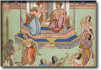 Ambarisha followed the vrata very piously for one whole year and on that particular day of the occasion he went to the temple of Narayana at Mathura and had a holy dip in the river Yamuna. As a part of charity he distributed lot of gifts and cattles to the poor and needy. During this time the great Rishi Durvasa came to Mathura and met Ambarisha. So the King told him about his Dvadasi Vrata and requested the rishi to be his guest for the day. Durvasa rishi also obliged to the King's request and invitation and then went to the river to bathe and to perform his daily rites. After having a bath in the holy water and when Durvasa sat for his meditation he got himself deep into it and was lost from the world for a while. Ambarisha was getting very worried if he is going to miss the auspicious time to perform the rites and pooja, for if he misses the vrata it goes off vain and it avails no power. Ambarisha was in a dilemma for he cannot break his fast with the rishi which will be a great insult to Durvasa. Being invited and if due respect is not given, the powerful rishi Durvasa might get angry. So the king decided to compromise by sipping a little water which the sastras say is both eating and non- eating. Thus now the king was happy for he didn't miss the right time to complete his vrata nor did he mean any offence to the great sage.