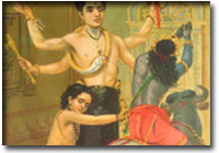 "You are not greater than Shiva the Eternal, you powerful Lord of death, you have to wait." So saying Markandeya embraced the idol of Lord Shiva in the temple. "Is that so?" Yama sniggered and threw his rope around the idol, trying to pull both together towards him. That is when Shiva appeared in person. "Don't Yama," ordered the Lord, "Stop it and leave now. From this day, I grant Markandeya a boon. He will not be touched by death ever and will live eternally as a sixteen year old." Yama was confident of his power that he let it go to his head. "Shiva or no Shiva, Markandeya will go with me," so saying he pulled with all his might. Shiva was very angry. "Stop Yama, you have exceeded your power. How dare you touch me?" Realizing his mistake, Yama immediately fell at his feet, "Forgive me, Lord," but it is you who had given me this power to me, my Lord," he said, "and Markandeya's time on earth is over." "You forgot one thing that I said, Yama, "Lord Shiva was still angry. "I had said that you have to obey my orders but you dared to defy me," he continued. "Go away, Markandeya will live forever." His parents were very happy and offered prayers at the temple.