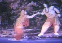 "Brother this is Mareecha playing his trick," bawled out Mareecha from a distance. But the husband and wife in their excitement paid no heed to his note of warning. Sita again requested Rama to atleast chase and get hold of the golden deer. So Rama instructed Lakshmana to take care of Sita, so that he can run behind the eluding deer. Thus parted he with Sita and chased the phantom, not knowing that he was not to see her again for many a painful month. The strange and bedecked deer moved on its fantastic way. Now it lingered, now it darted hither and thither. Now it was near at hand, now again far away. It dodged and drew Rama far, far away from his first home. Fed up with following the deluding deer Rama aimed his unfailing arrow at the animal. It vanished; in its stead Mareecha fell dead after crying aloud, "Ah Sita! Ah Lakshmana!" That voice was the simulation of Rama's very voice indicating thereby that Rama was in agony and he cried aloud for help. That alarmed cry for help reached the anxious ears of Sita. She at once alerted Lakshmana and persuaded him to run to help his brother. But Lakshmana stood firm obeying the command of his brother. Now Sita requested Lakshmana to go and help Rama instead of being a guard to her, for she told him that she can sense the smell of her husband in danger. But Lakshmana was very hesitant to go leaving Sita alone. Lakshmana closed his ears with his hands and pleaded and asked her to be calm and he explained that nobody in this world can attack Rama and he is going to return safe. He also told Sita, that it looks like some tricks played by the rakshasa and it was not the voice of Sri Rama. Lakshmana conveyed to Sita that he cannot disobey his brother's command.