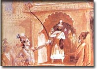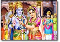 Viswamithra's group quietly entered the extensive compound and got up for the sacrificial rites at Mithila. The king was delighted to hear of the arrival of the spiritual giant Viswamithra at his sacrificial theatre. He presented himself before the sage and expressed his gratitude for the former's reigning to sanctify the sacrifice with his holy presence. Presently the King's attention was inquisitively drawn towards the heavenly handsome lads found among the hermitage. The different phases of the sacrifices started and finally the last phase of horse sacrifice was the selection of a suitable groom to Sita of heavenly beauty whom the King Janaka had obtained as a boon from the mother earth. Exceedingly trying was the test of the worth of the prince who would sue for the charming Sita's hand in betrothal. Whoever lifted, bent and strung that unwieldy bow became the partner of that priceless princess of Mithila. Many a prince dare not try the test which was humanly impossible. Now at the request of sage Viswamithra, the great and the godly bow was dragged on a suitable chariot to the assembly. The huge crowd gazed at the stupendous bow with amazement. The royal suitors in particular were dazed at the impossible test. The sage expectantly looked at Rama. The obedient pupil bowed to the master and gracefully walked towards the bow of Siva. There was a hushed silence among the audience. With ease the divine youth took up the bow.