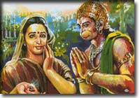This was just at the time when Jankai was to commit suicide. She desisted from her desperate action. Her ears were involuntarily intent on the vocal feast. It balmed her pained soul. Sita felt a new lease of life infused into her. Still she interrogated, "Is this not a new trick of the demons to entrap me?. Hanuman said , "I assure you, O adorable one, I am a messenger from your Lord." Sita was confused and she asked Hanuman, "How am I to know it?" Hanuman got permission from Sita and appeared before her and he proved it, by landing from the tree, prostrated and stood reverently. Sita found him perfect and sturdy in body, clear in mind and ardent in Rama's commission. Asked by her he recounted the developments of the events since she was lost. He concluded, "Rama and Lakshmana are grieved over your loss, they are determined to redeem you wherever found. I am a minister of Sugreeva, the king of Kishkindha. This king has dedicated himself, his kingdom and his people to serve Rama in his attempt to save you. His monkey subjects have gone in all directions in search of you. Among them I am lucky in finding you. Rama asked me to inform you of his welfare. Lakshmana sends his reverence to you. Here is Rama's signet ring to testify the validity of my message." Sita received the signet ring, scrutinized it and pressed it to her closed eyes with joy and devotion. Now she evinced motherly love towards the messenger. Anjenaya assured Janaki that when he reported her whereabouts to Rama he would with the help of Sugreeva's army invade Lanka, vanquish the wicked despot along with his race and redeem her.