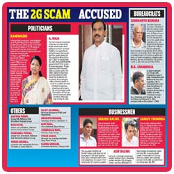 Some of the politicians and Bureaucrats who were accused in the 2G spectrum scandal were:- A. Raja, the Ex-Minister of Communications and Information Technology.