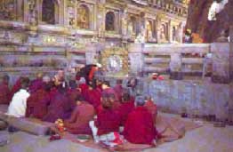 The Buddhist trail from Sarnath to Bodhgaya attracts more pilgrims from foreign countries. Popular times of pilgrimage are full moon nights and the auspicious dates of Buddha's birth, enlightenment and death. Crowds of pilgrims clad in saffron or deep red ochre offer flowers, light oil lamps, set up flags and then go in for silent meditation, counting their beads and chanting verses from the Buddhist texts.