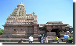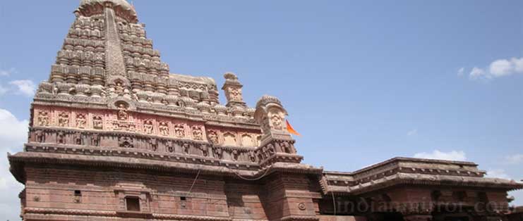 The famous Ajanta Caves and Dulatabad town of Maharashtra are situated nearby. The temple, with exquisitely sculpted walls were also built under the patronage of Queen Ahilyabai Holkar, one of the rulers of the erstwhile state of Indore. The most impressing feature of Gharishneshwar Temple is the 5 tier shikara. The shikara here rises in decreasing height. The height is then increased with the help of the high wall component of the sanctum. An unerect bull at each corner and monkey behind it is the crown of the Shikara.