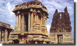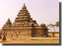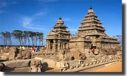 The Mahabalipuram Temples consist of several temples of enormous size, which were built by cutting huge boulders into exquisite carves and set against the background of unfathomable sky and vast sea. This was a concept of great Pallava Monarch Rajasimha, which was built during the period 830-1100 AD in the Pallava dynasty. Few of the great monuments of world stand here near the seashore. The freestanding monolithic temples are called `Rathas`. The cave temples are lavishly sculptured with the narration of the story of Arjuna obtaining the `Pasupata`. The temples with two towers, familiarly known as shore temples, also enhance the charm of this place.There are two low hills in Mahabalipuram which are situated about 400 m from the sea which has eleven excavated temples on both sides, known as `Mandapas`. There is another unique type of temple standing nearby, called `Ratha`s , which have been cut out of large rocks. There are a total of five Rathas and three big sculptures of Nandi (ox of Lord Shiva), Lion and an Elephant. On the top of the bigger hill, there is a structural temple and in a little distance `Vijayanagara Gopura` is also situated.
