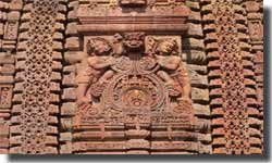 The decorated torana archway in front of the Jagamohana is a masterpiece dating from about 900 AD. It is a detached portal consisting of two pillars supporting an arch within a semicircular shaped pediment. The magnificent decoration of the arch, with languorously reclining females and bands of delicate scroll-work serves as the most striking feature.