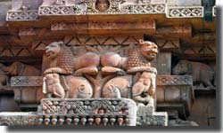 The jagamohana, which is adjoining the square towered shrine has an additional doorway on the South and has four latticed windows, one each on the North and South and two on the West, the lastly it is decorated with wonderfully animated bands of dancers and musicians. The recurring motif is highly-ornated chaitya-window which is very often filled with animal, human and divine figures, the last including busts of Shiva. The main entrance to jagamohana even has a fine carving of domestic elephants capturing wild ones, to the left of the lintel.
