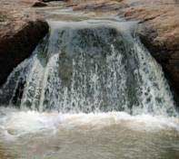 Smooth slanting rocks interrupt a stream, making a huge natural water slide.