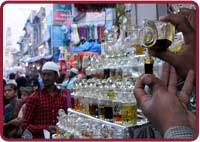 Ittar is sold in number of stores in Charminar and they are available in varying fragrances like jasmine to rose, lilies to woody notes and much more. There are lots of choices of the Ittar products. This is supposed to be a natural perfume obtained from lot of botanical sources. The shopkeepers selling the ittar claim that they import it from different countries like Diors and Guccis. Though there are no shops in Charminar selling branded footwear there are so many stores and shops on the pavements selling colorful vibrant foot wears. Most of the college goers and teenagers prefer to buy footwear from here because they can match with their everyday costume. Most of the footwear sold here are available at a throw away price. Charminar market is one place in Hyderabad which has thousands of shops and most of them are into selling of accessories.