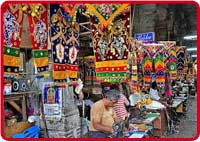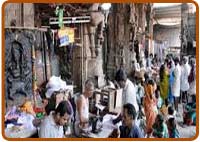 Pudhhu mandapam is the most ideal place to buy cotton and printed fabrics. Pudhu Mandapam also has the option of getting your material stitched with the readily available tailors all busily treading away and capable of whipping up a good replica of whatever you're wearing in an hour or two. They usually charge Rs 150 - Rs 200 and depending upon the complexity of the design the rate keeps varying. The best mode of transport in and around the temple area is auto rickshaws and cycle rickshaws; however entry of four wheelers is restricted after a certain point. Not only the vendors on the pavement but also the shop owners of small stores charging exorbitantly high because this is one place in Madurai which is always crowded with tourists from different parts of the country and the natives of Madurai. This place is noted for its cotton fabrics and Batik and Sungundi Sarees which adorn the wardrobes of Madurai women. But all we need to do is to pull up our socks and get ready for bargaining to strike a fair deal and carry our favorite item.