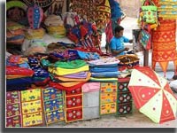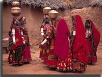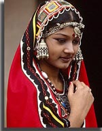 Banjara women wear a full length skirt with borders embroidered in mustard and green thread. They also wear pretty silver anklets.