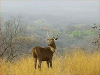 Sambar is the favorite prey species of the tiger, lion and dholes. When encountering danger a Sambar will stamp its feet and make a ringing call known as "belling" or "pooking".
