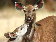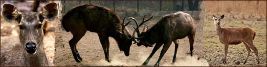 foot stamping and at times by tree marking. The male deer guard their territories and attract their pair through vocal and olfactory means. The gestation period lasts for about 6 - 8 months and litters one calf at a time. The calf weighs 5 to 8 kgs and has brown hair with light spots over their body. The spots disappear once they grow at age. The calf is weaned for 7 months and stay with their mother till 2 years of age.