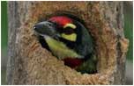 This grass green colored bird with crimson colored forehead and breast has a very distinct call which is more likely the sound made when the coppersmith strikes the metal with hammer. It has distinct colors throughout its body with red forehead, yellow colored eye-ring and throat patch with streaks underside and upper parts are colored green. Both males and females are alike.Juveniles look duller and don't have red patches. It is best known for its metronomic call. Like other barbets, they build their nest by chiseling out a hole inside a tree.