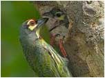 They may also use the tree holes as nest. In a single clutch about three to four eggs are laid. The incubation period is approximately 2 weeks. Both males and females involve in incubation. The eggs are glossless white and the parents involve in securing the eggs from predation until they are hatched. Juveniles look duller and don't have red patches. The zygodactyl feet which have two toes forward and two backward helps them in clinging on trees but their tail feathers are not stiffened.