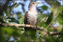 Indian Cuckoos are medium sized, solitary and shy birds. The upperparts are grey in color and the under parts have broad black color feathers. Young birds have a white marking over their crown, chin and throat which makes it look contrasting in a dark face. The tail of the bird is barred with white tip at the broad and dark sub terminal band. The juveniles are brown colored with white markings at the head and wing feathers. They have a gray to yellow marking round the eye-ring. The color of iris ranges from light brown to reddish. Both males and females look akin except the females being paler in color when compared to males. Females have dark brown feathers on their breast and tail. The belly is narrower than in male. The beak is orange yellow with brown color at the tip.