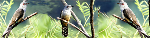Grey-bellied Cuckoo (Cacomantis passerinus),Asian Emerald Cuckoo (Chrysococcyx maculatus),Violet Cuckoo (Chrysococcyx xanthorhynchus), Asian Drongo-Cuckoo (Surniculus lugubris), Surniculus dicruroides (Fork-tailed Drongo-Cuckoo), Blue-faced Malkoha (Phaenicophaeus viridirostris), Green-billed Malkoha (Phaenicophaeus tristis), Sirkeer (Malkoha Taccocua leschenaultii),Greater Coucal (Centropus sinensis),Andaman Coucal (Centropus andamanensis) and Lesser Coucal (Centropus bengalensis).