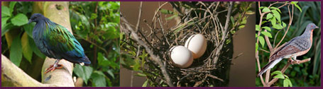 In general the female pigeon lays 2 white eggs. A pair may raise five or more broods per year. Both male and female will sit on the egg to incubate it even though the female doest the incubation during the night hours. This incubation period lasts for about 16 to 19 days and the nestling takes about ten days and the young bird leaves the nest in four weeks or 22 to 29 days after hatching. Both male and female feed the young with the 'pigeon-milk', a regurgitated, protein and fat- rich liquid food produced from the parent crops. After 10 days period the young are fed with the solid foods such as caterpillars.