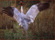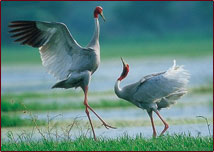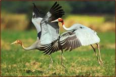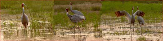 indulge in spectacular displays of calling in unison and posturing. And also they produce "dancing" movements which are performed both during and outside the breeding season. And these species may make a short series of jumping and bowing movements as one of the pair circles around the other. The Sarus cranes breed mainly during the Monsoons in India. That is the duration from July to October.