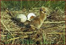 The Sarus cranes' nest is two meter (6 feet) in diameter and the height of the nest is one meter (3 feet). These species may refurbish and reuse their nests for the next breeding session also. These species will use the same site for up to five breeding session. The clutch size of this species is one or two eggs. Both male and female will involve in the incubation activity. The incubation period for this species is 27 to 35 days. Their eggs are chalky white in colour and weight of these eggs is about 240 grams.